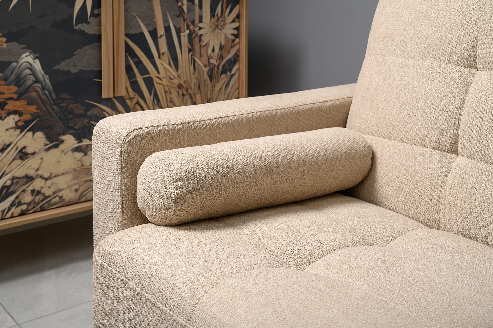 Едва заметный эффект букле на мягкой и объемной фактуре наполняет общую атмосферу интерьера теплом.
