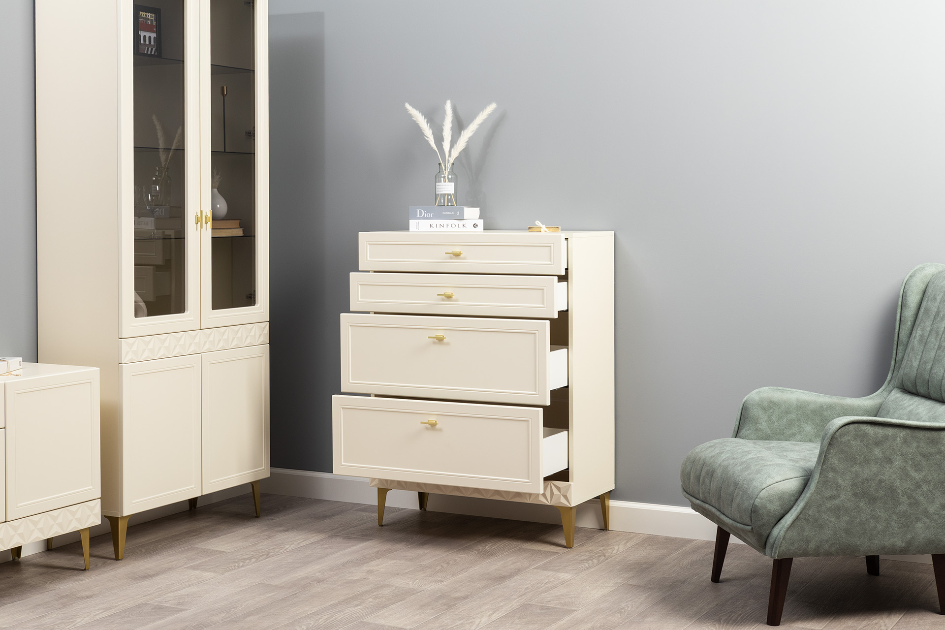 Комод Марион 16.249 дымчатый зеленый K521, олива шагрень AG 1050 ПВХ, белый PE шагрень