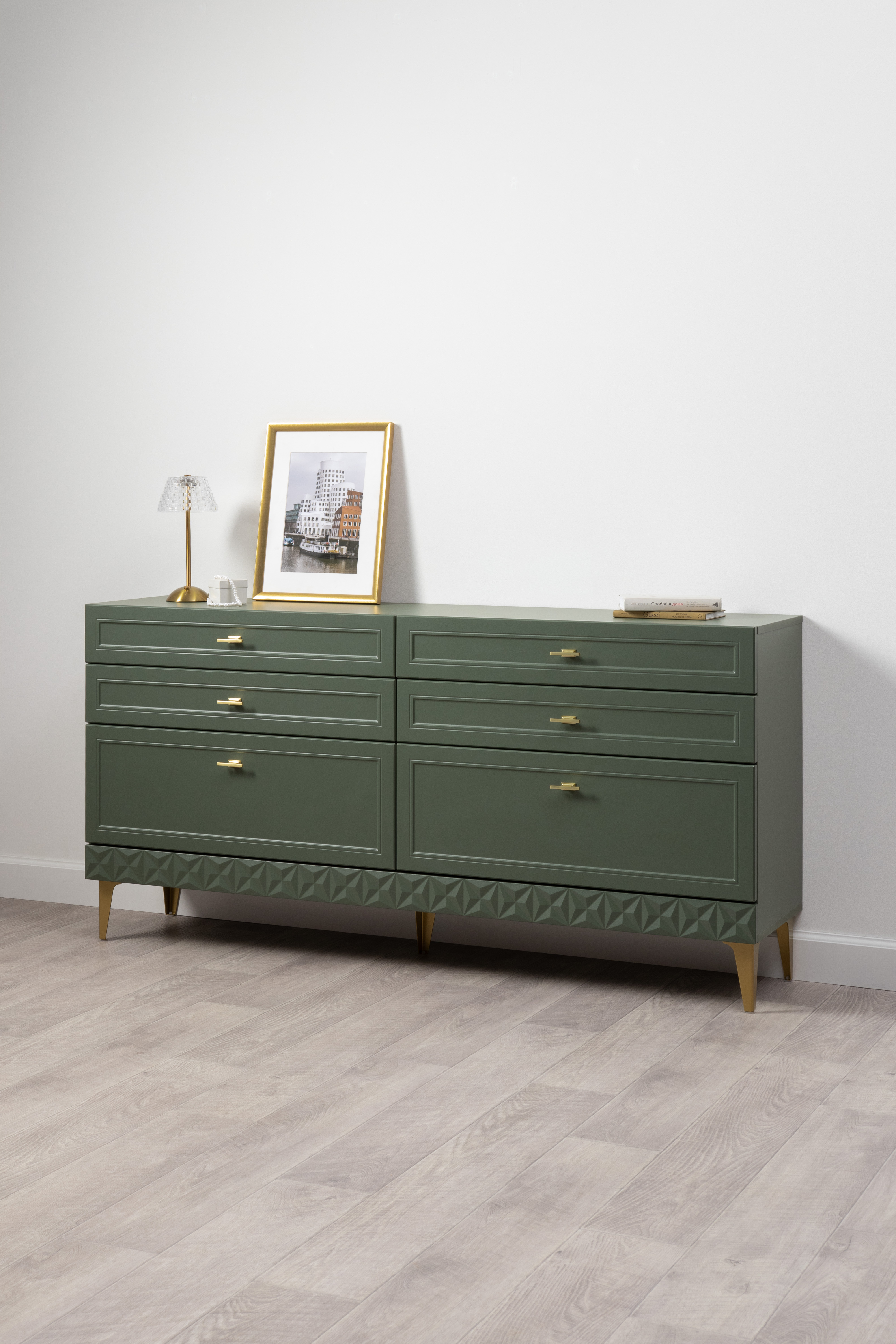 Комод Марион 16.256 дымчатый зеленый K521, олива шагрень AG 1050 ПВХ, белый PE шагрень