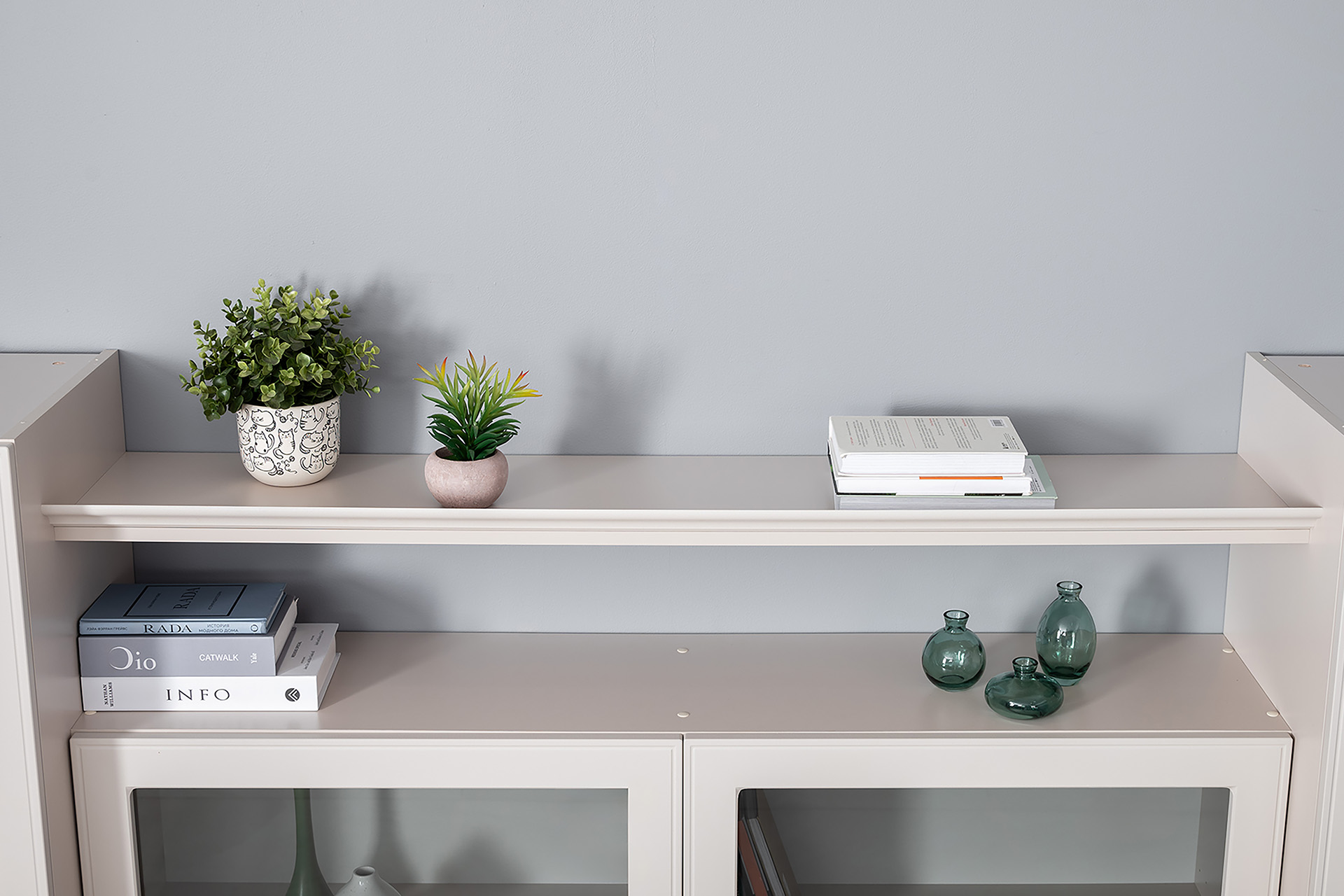 Фрезерованные фасады из МДФ, металлические ручки и витрины с тонированным стеклом создают изысканный образ.