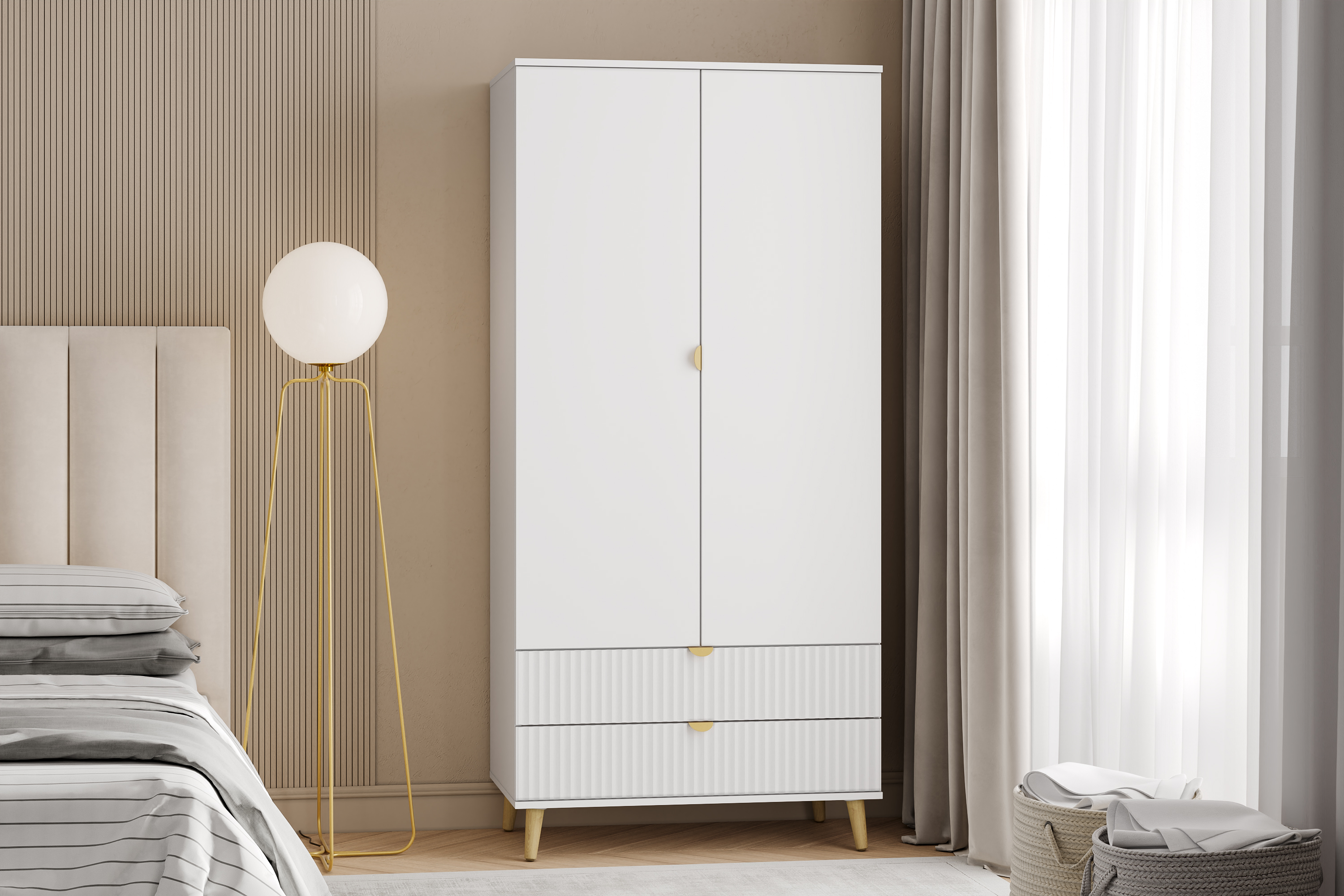 Модульная композиция включает комод, оснащенный выдвижными ящиками, которые открываются плавно и бесшумно благодаря шариковым направляющим, а в шкафу удобно организовать предметы одежды, при этом высокие опоры облегчают процесс уборки.