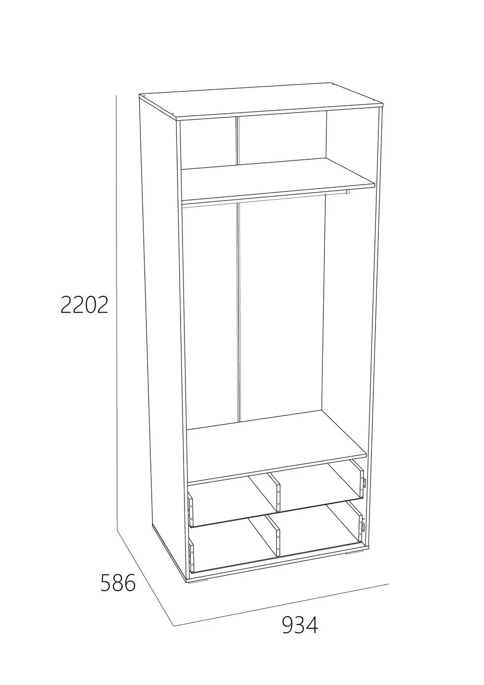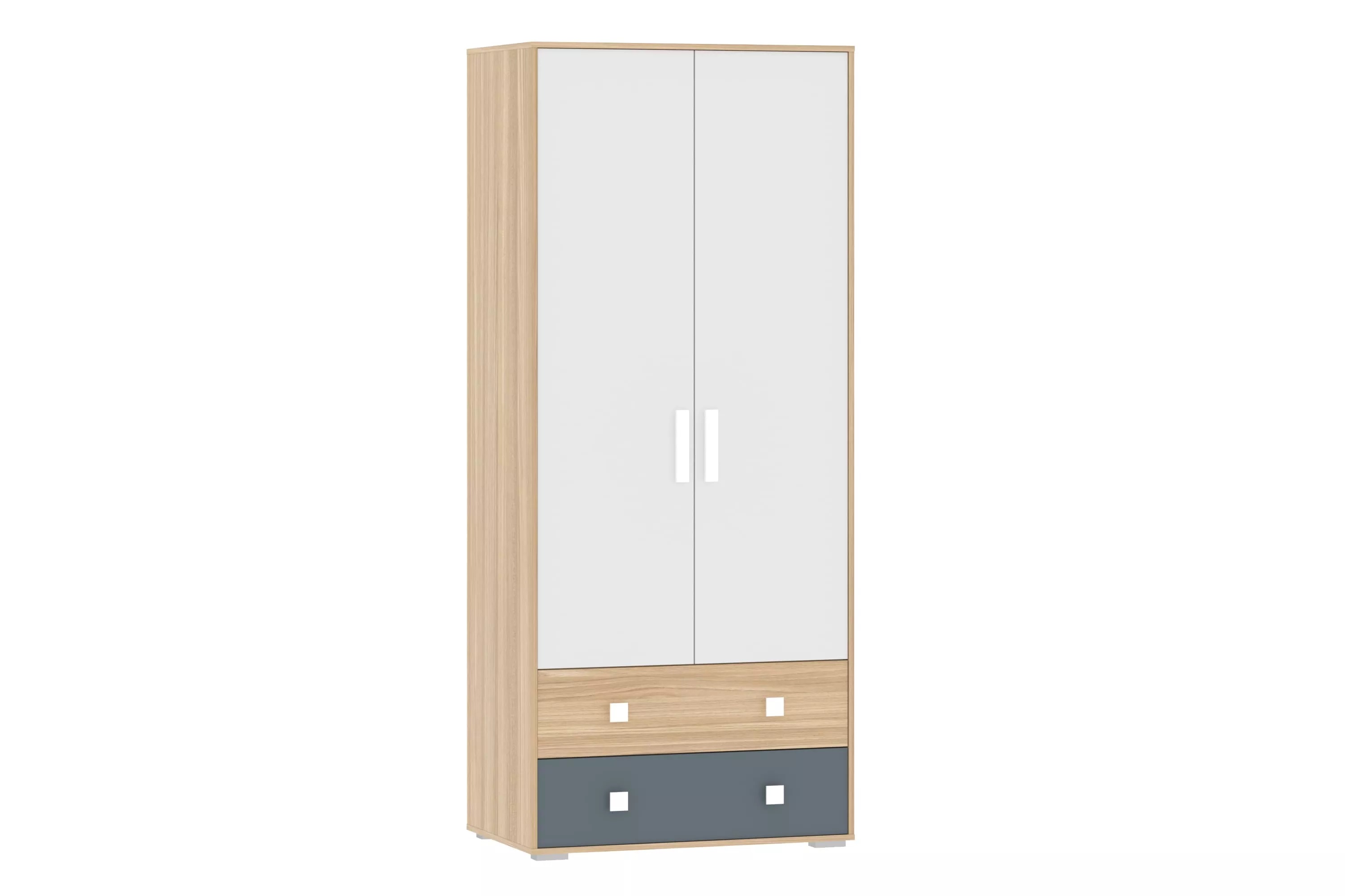 Внутри двустворчатого шкафа предусмотрена овальная штанга для одежды на вешалках, а также шкаф оснащен двумя выдвижными ящиками. Комбинируйте шкаф для одежды и одноименные модульные шкаф-пеналы или стеллаж, чтобы создать системы хранения на любой вкус и размер!