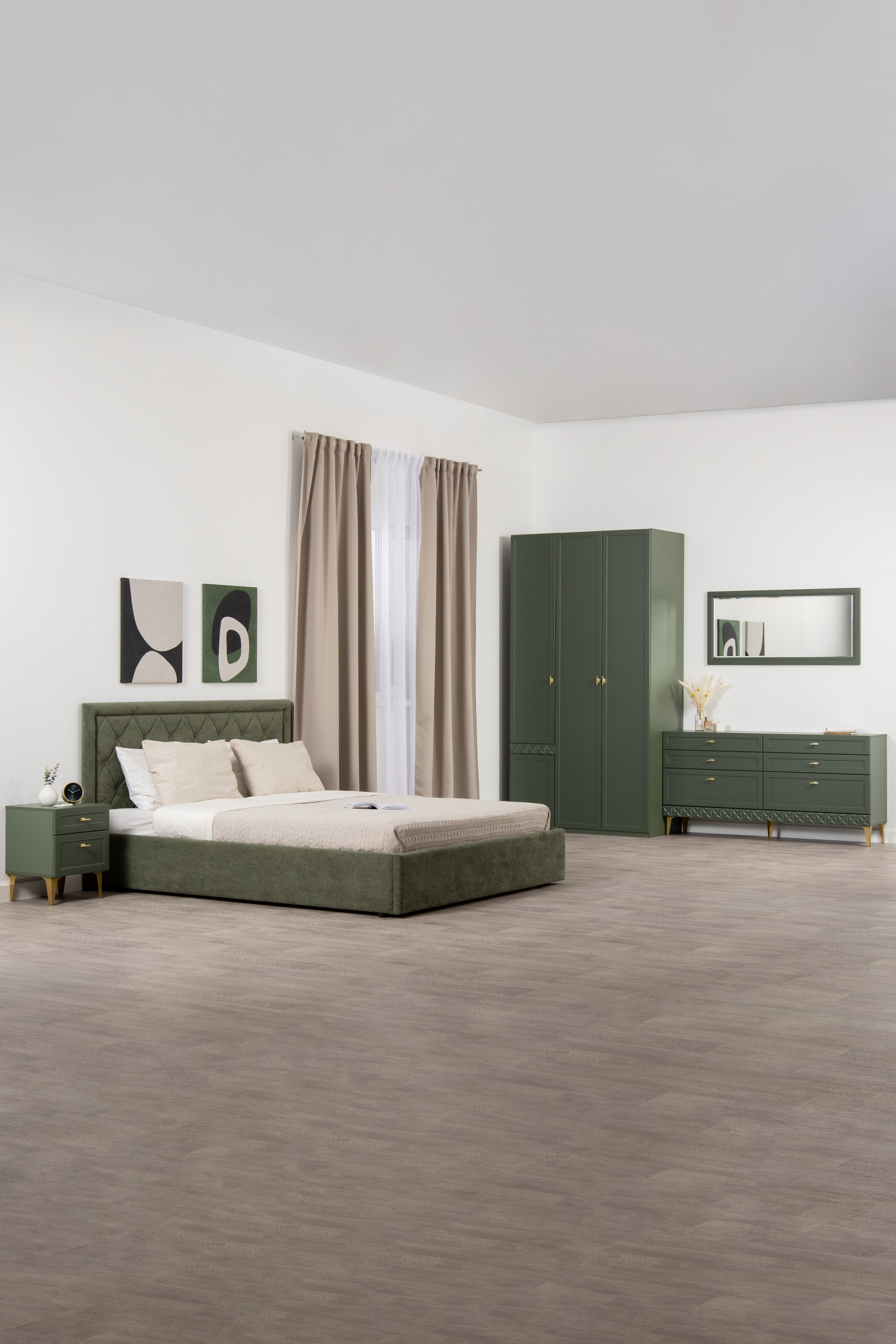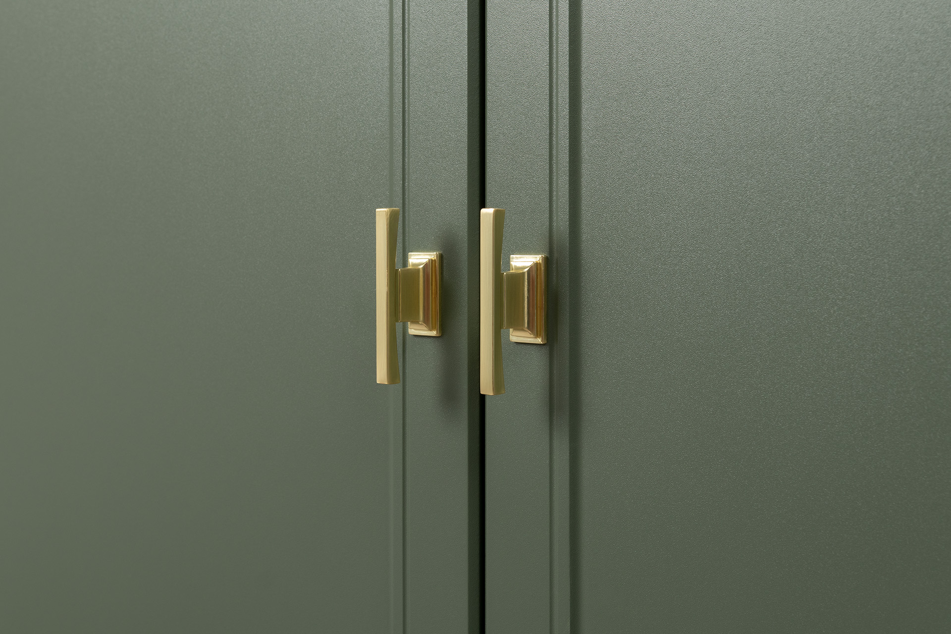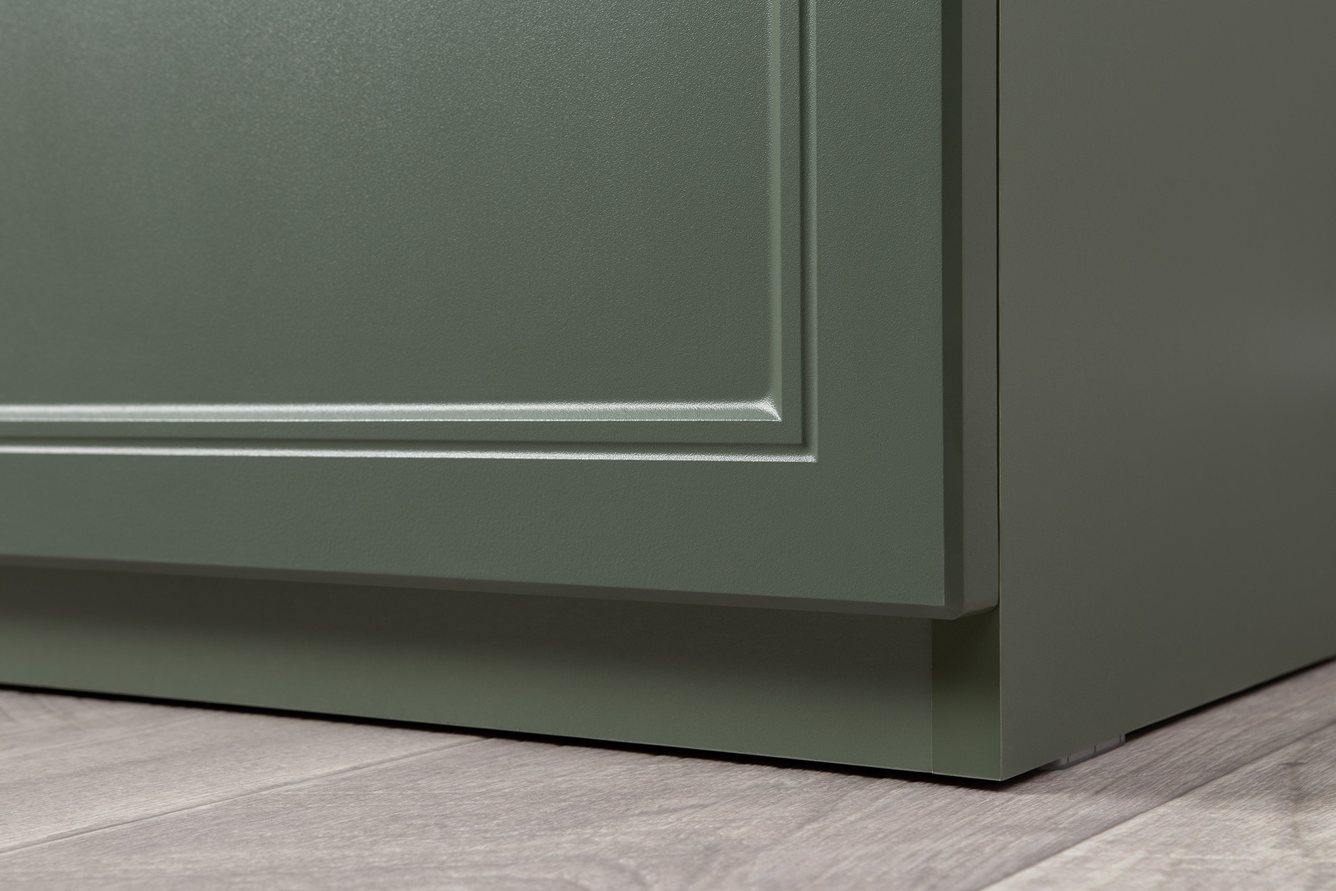 Изящные линии, глубокая фрезеровка фасадов из МДФ и благородные оттенки. Утончённая «Слоновая кость» и изысканная «Олива Шагрень» с глубоким зелёным тоном — создают атмосферу уюта, тепла и благородства. Металлические ручки и опоры золотого цвета придают мебели утончённый блеск, а петли и направляющие с доводчиками обеспечивают плавное и бесшумное закрытие фасадов.