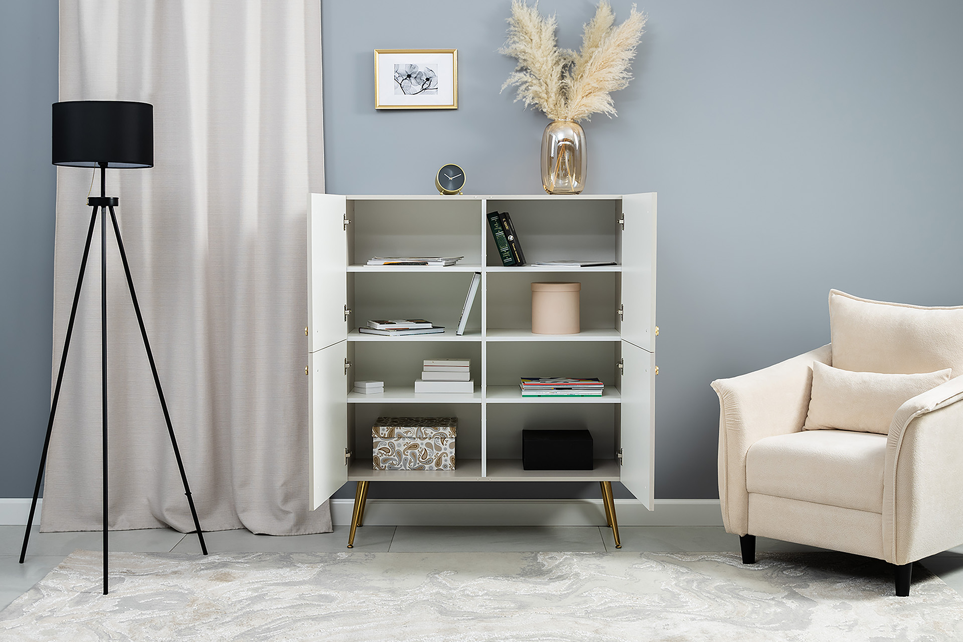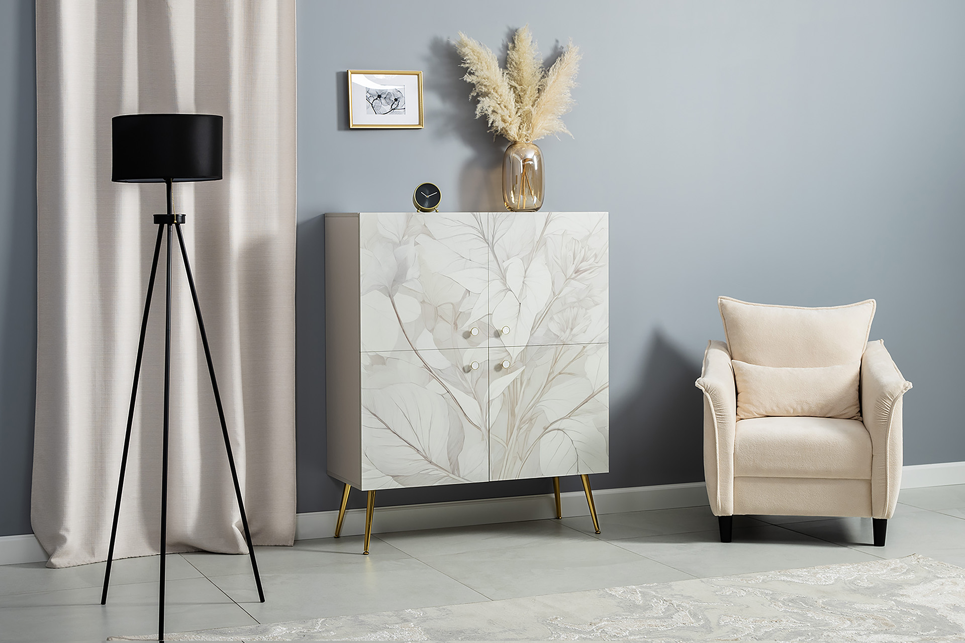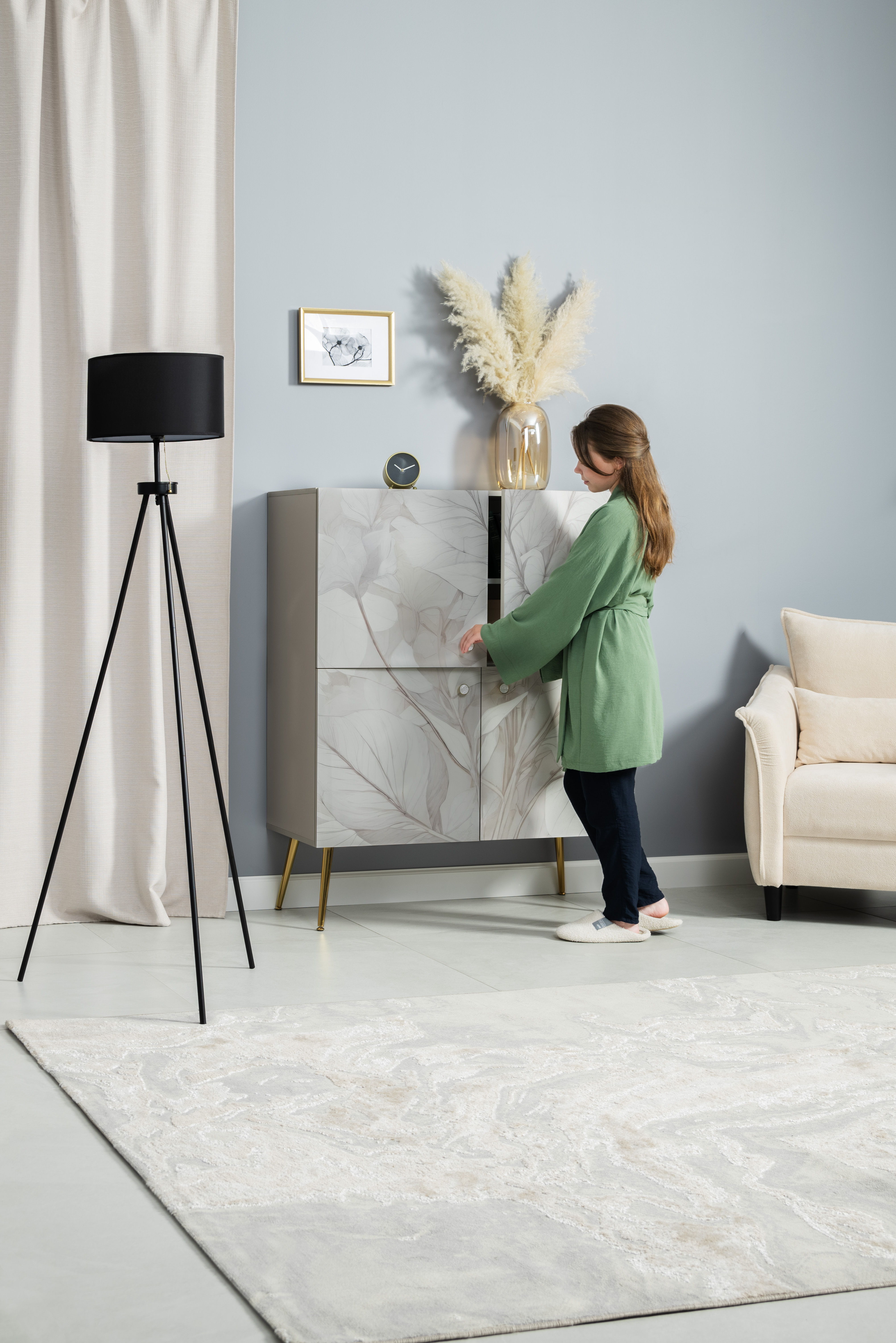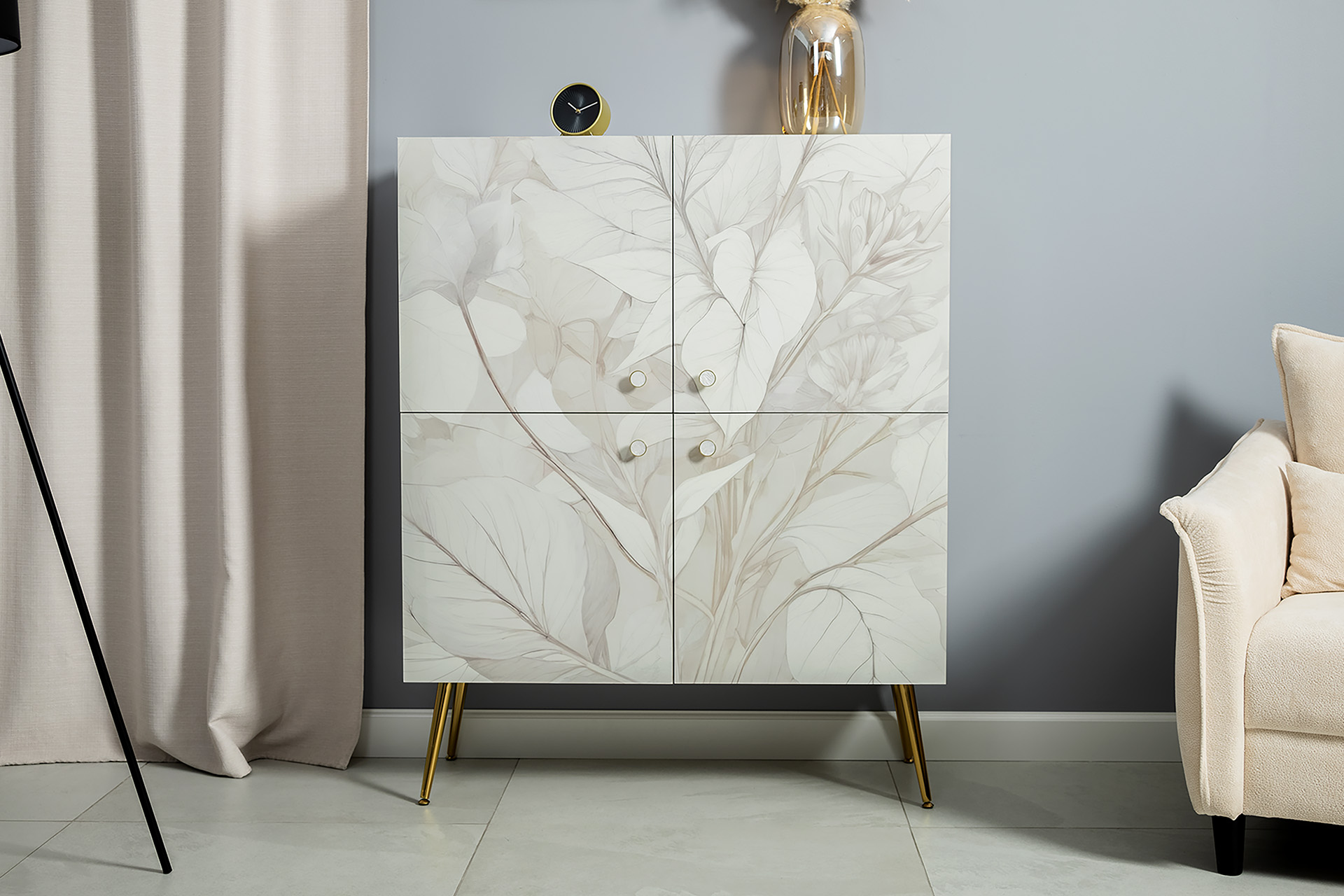 Шкаф Флоу 16.329 выделяется растительным принтом на фасаде, создающими свежий и стильный акцент в интерьере. Металлические ручки и опоры с регулировкой придают конструкции надежность и современный вид. Вместительные отделения, петли с доводчиком и скрытая задняя стенка обеспечивают удобство хранения и аккуратный внешний вид.