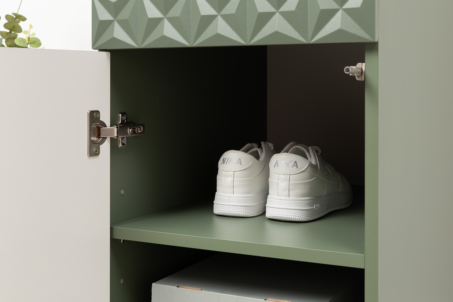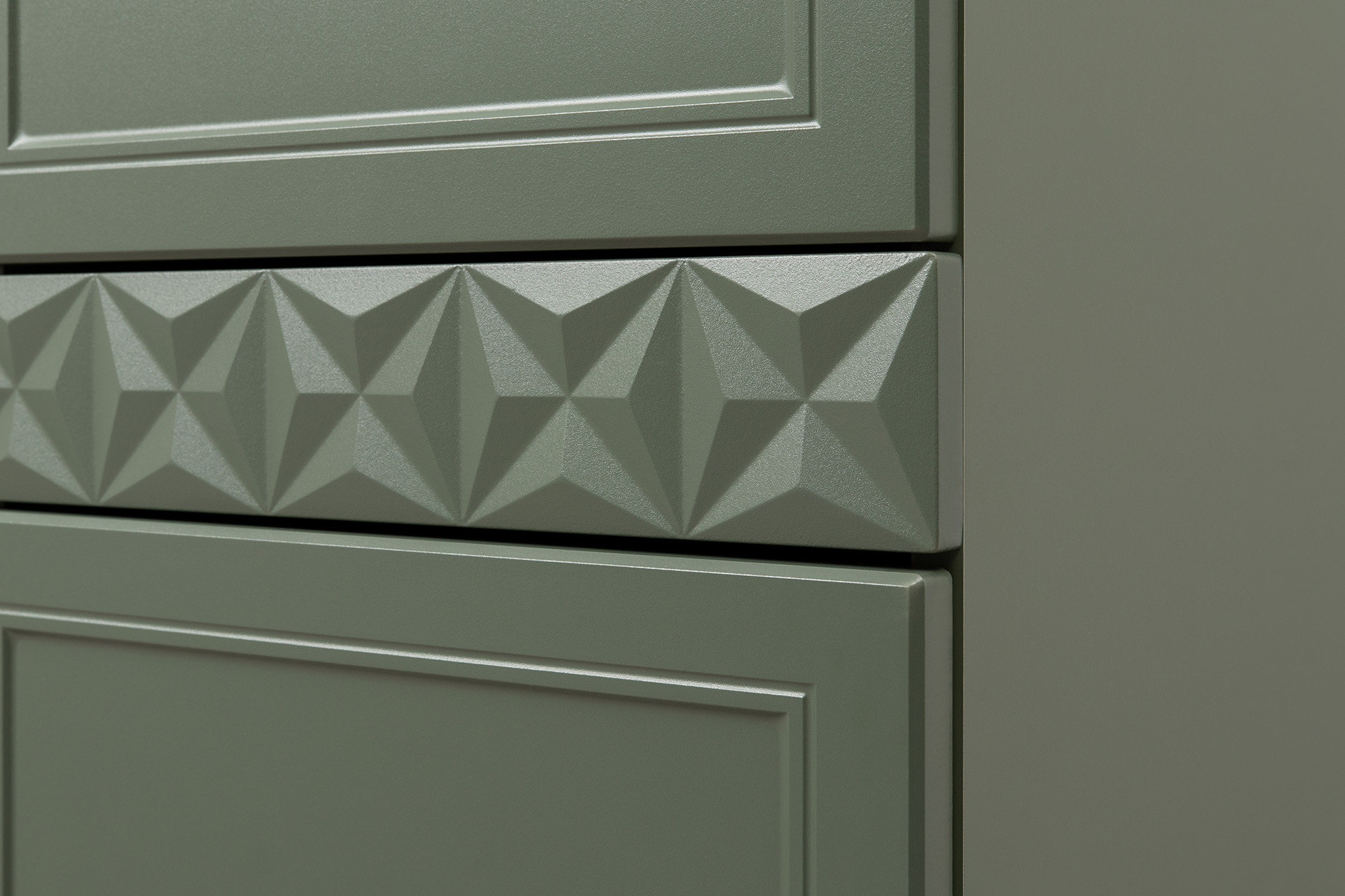 Изящные линии, глубокая фрезеровка фасадов из МДФ и благородные оттенки. Утончённая «Слоновая кость» и изысканная «Олива Шагрень» с глубоким зелёным тоном — создают атмосферу уюта, тепла и благородства. Металлические ручки и опоры золотого цвета придают мебели утончённый блеск, а петли и направляющие с доводчиками обеспечивают плавное и бесшумное закрытие фасадов.